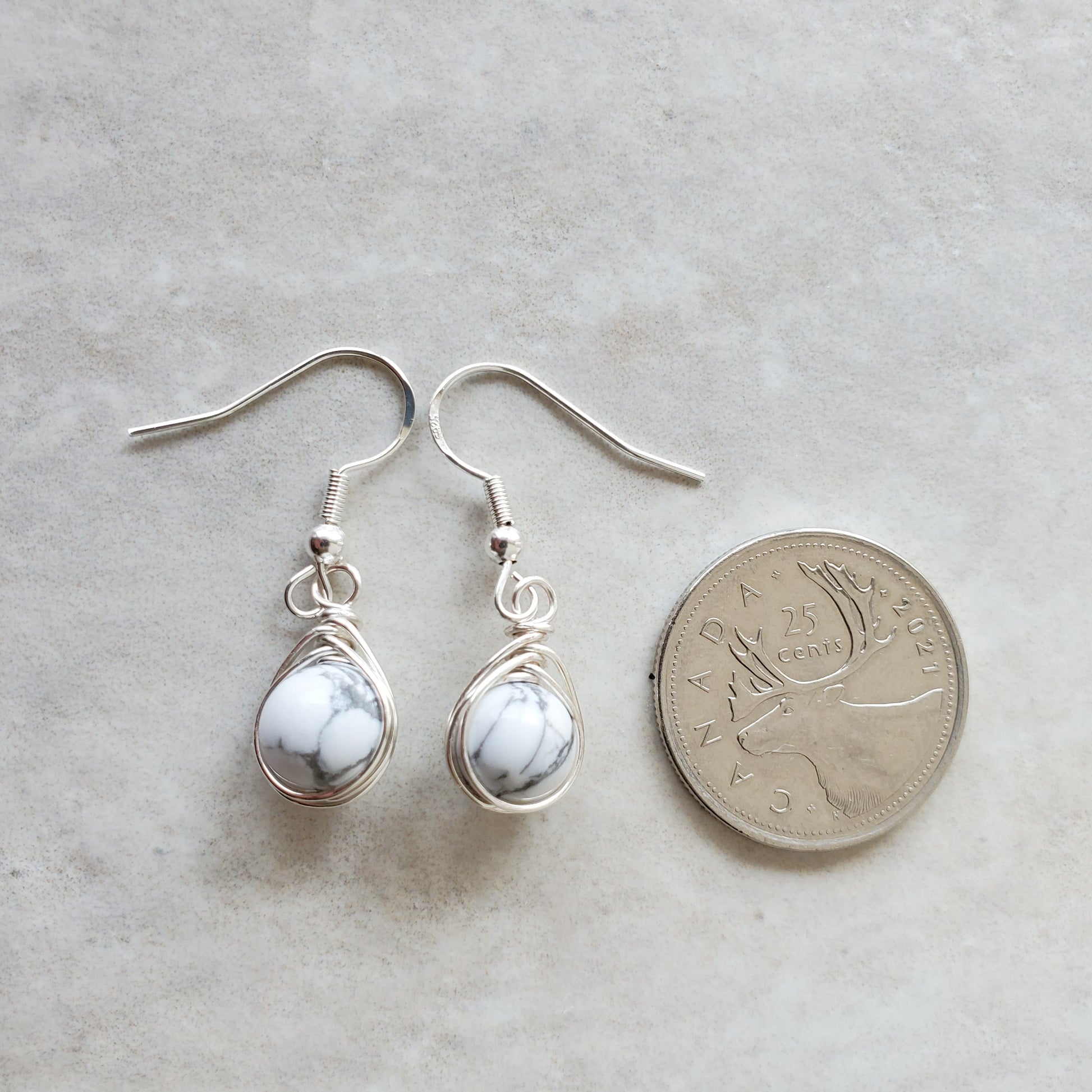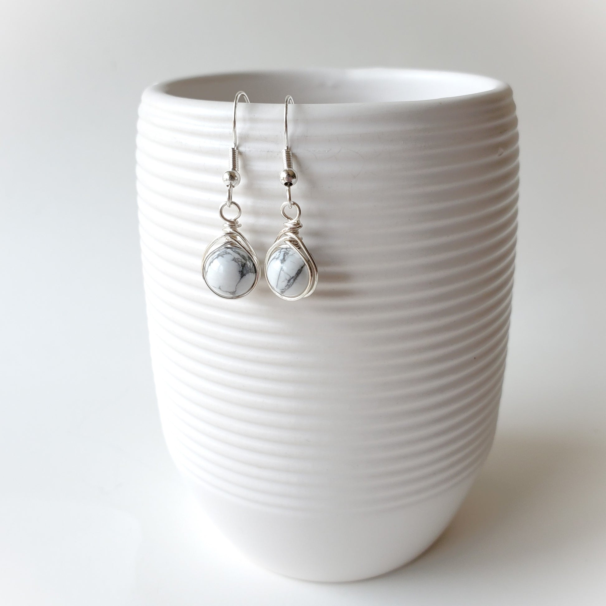 Perfect for everyday, these 8mm Howlite stones are wrapped in a herringbone pattern and hang from genuine 925 sterling silver ear wires.